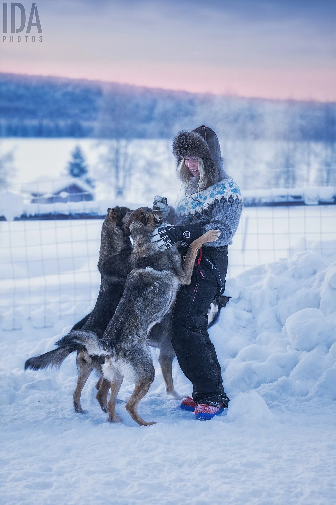 beautiful lake Venejärvi in Finnish Lapland. Eleven of our dogs are Siberian and Alaskan huskies who are energetic sled dogs with motors in their paws. We also share our home with a gentle Australian Shepherd and a curious Finnish Spitz.
